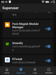 Install it, and once it opens grant it superuser (root) rights (a popup should open). We’ll need to do this for a number of applications we want to give root access to – but we should do it sparingly and manually. Fox’s MMM is fine for this. Magisk handles which applications have superuser rights – you can see this on the bottom of the Magisk manager app.