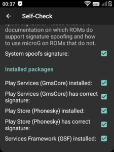 All being well we can now “fake” out Google apps permanently. Run the microG configuration and perform the self-check again – this time you should see a tick beside system spoofing and everything looking happy.
