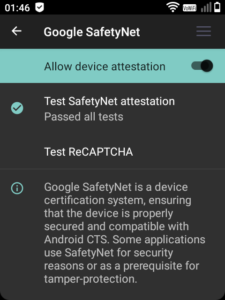 Luckily we can also defeat/pass SafetyNet – but there are a couple more steps. Passing the SafetyNet is a good test that you have entirely defeated Google’s checking mechanisms, and that your phone looks to them (and other software) entirely “normal” – with no Google software present at all.