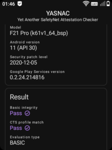 The first thing to do is install a SafetyNet “attestation” checker. A nice simple one is YASNAC (yet another safetynet attestation checker) available on the Play Store (install it using Aurora). If you attempt to run the checker – you will most likely find it fails.
