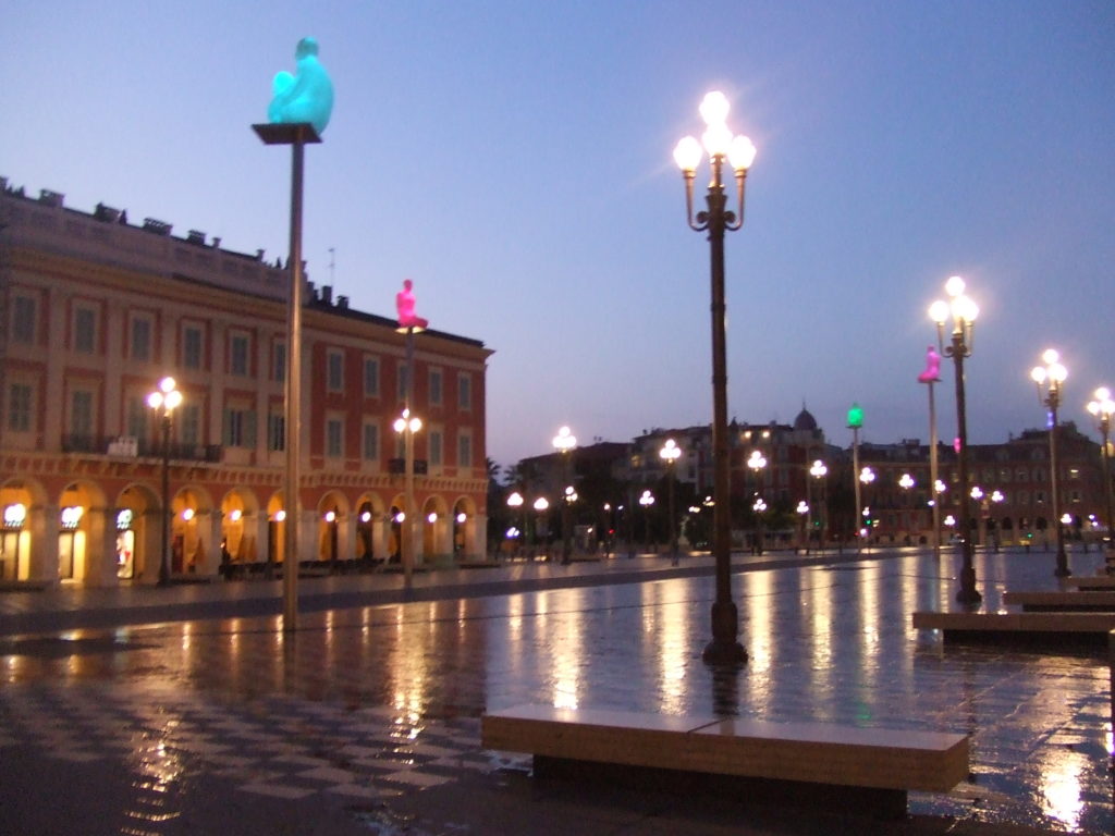 Main square in Nice, just outside Hotel Rex. Strange illuminated Buddha-like stylites add to the eeriness