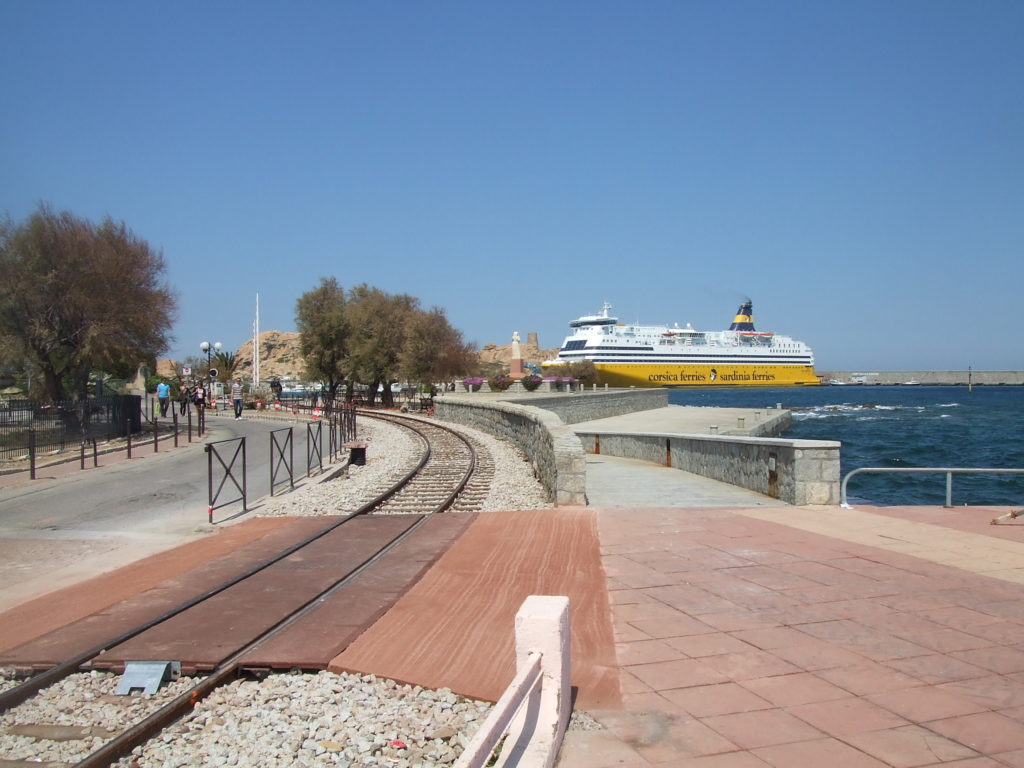 The Corsican railway in L’ile Rousse, and my boat in the background, looking comically oversized for such a small place.